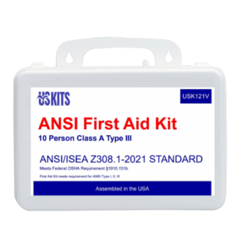 - The USKITS 10 Person ANSI First Aid Kit, Class A, Type III is provides quick and easy access for mobile indoor/outdoor use for the most common workplace first aid needs.