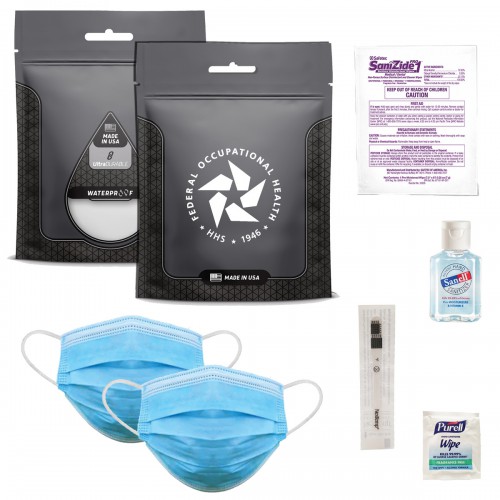 Bring your business to life with a great offer like this PPE kit 1.0! It's made in the USA and includes Sanizide surface disinfecting wipes, 1 oz. hand sanitizer, 2 disposable masks and more. Everything you may need to be safe when you go out or travel. Stash it in your car, suitcase, backpack, bike bag, travel bag, or carry-on luggage to always have it nearby.