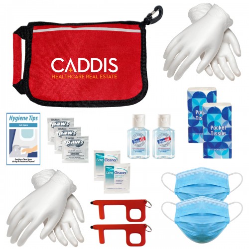 Family PPE Kit with duplicate NO Touch Key, Hand Sanitizer, Device Wipes, Nitrile or Vinyl Gloves, Tissues and protective masks.