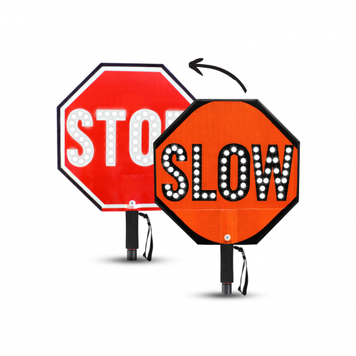 Our 18" Stop-Lite LED Paddle with white illuminated STOP and SLOW features 3M branded 3430 ENG Grade reflective on the STOP side, and 3M branded 3930 HIP Grade reflective sheeting on the SLOW side.