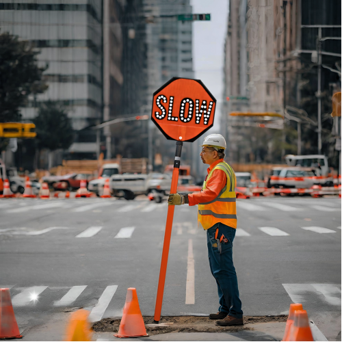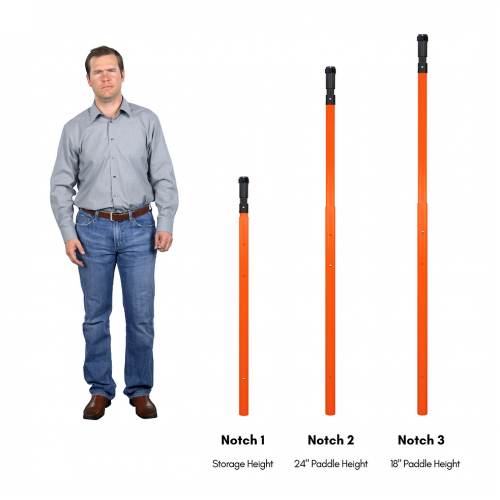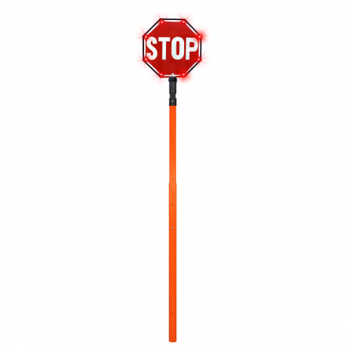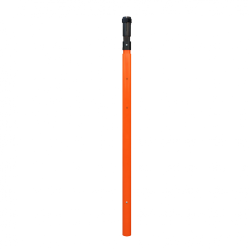 Our Adjustable Flagger Pole features an ergonomic design for a comfortable grip and a removable black topper with a velcro strap for secure paddle attachment.